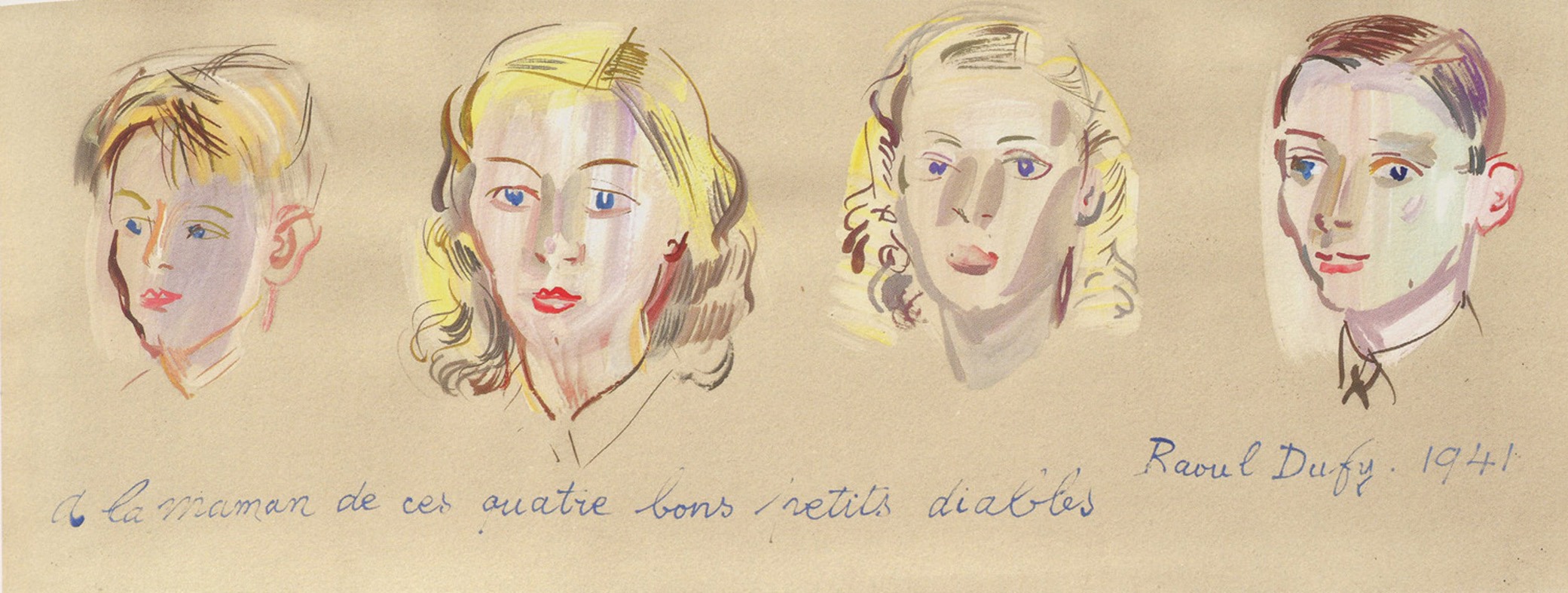 Description: Signé Raoul Dufy 1941 en bas à droite et portant l'inscription à la maman de ces quatre bons petits diables en bas au centre